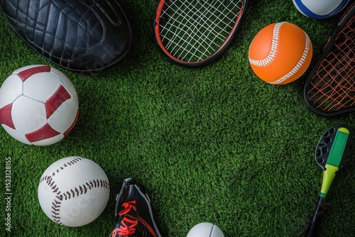 Variety of sports equipment arranged on green grass surface for multiple games and activities