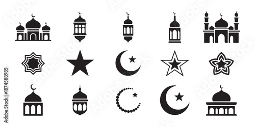 Various black silhouette icons for islamic holidays and architectural elements collection