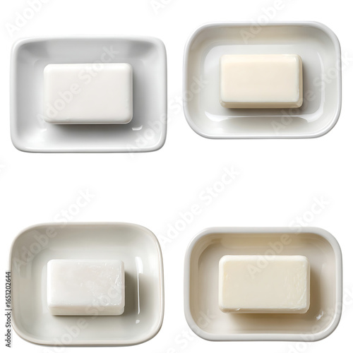 Various soaps on white ceramic soap dishes, ideal for spa or bathroom use
