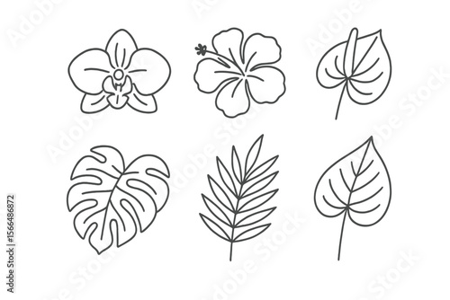 Various tropical flowers and leaves drawn in a minimalist style, showcasing nature's beauty and diversity in a creative format