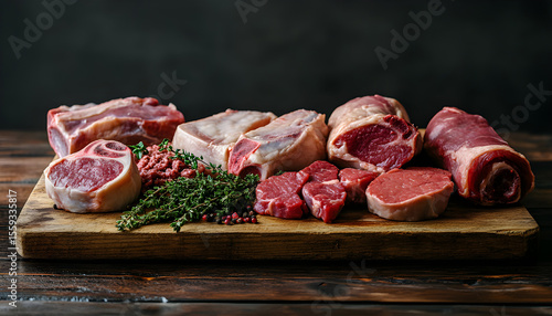 various types of fresh meat: pork, beef, turkey and chicken on a wooden table
