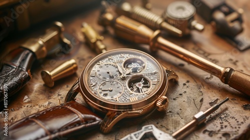 Various watches and tools neatly arranged on a wooden table.