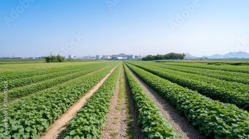 Vast agricultural fields stretching to the horizon under a clear blue sky. Parallel rows of vibrant green plants