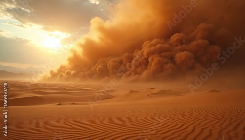 Vast desert landscape under dramatic orange sandstorm. Swirling sand particles reduce visibility across arid, barren terrain. Intense, harsh weather conditions create powerful, blustery, dusty