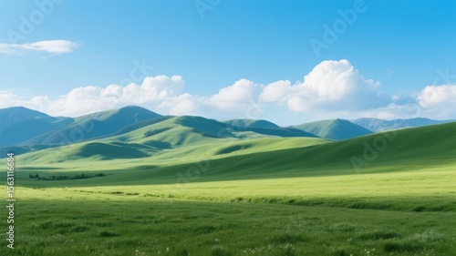 Vast Green Landscape with Rolling Hills Under a Clear Blue Sky