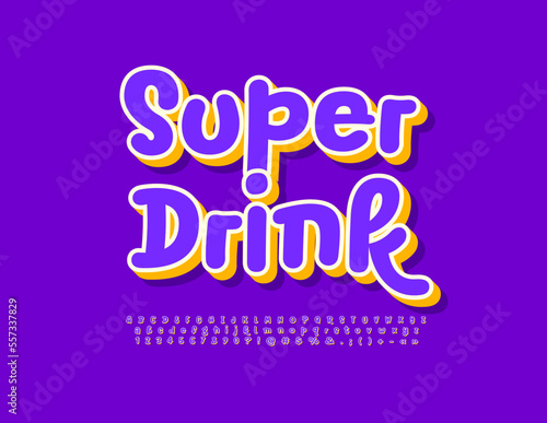 Vector advertising banner Super Drinks. Funny handwritten Font. Creative Alphabet Letters and Numbers set