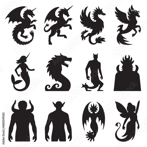 Vector art of a collection of diverse mythical creatures and fantasy beings depicted in silhouette