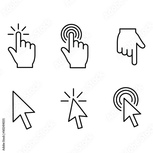 Vector art of a collection of six distinct click and cursor icons, featuring various hand gestures and pointer styles on a white background