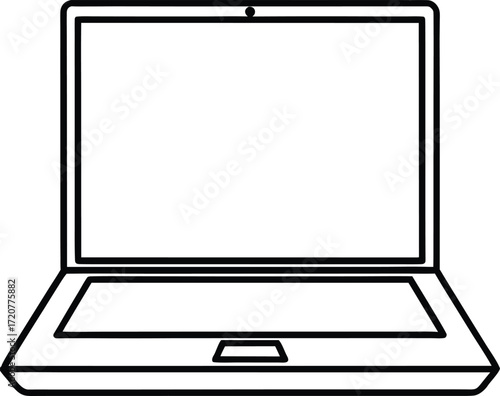 Vector art of a simple black and white line drawing of an open laptop computer, viewed from the front, isolated on a