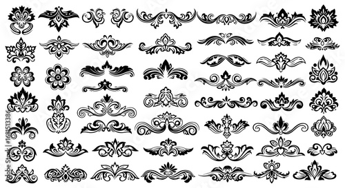 Vector art of collection of ornate black and white floral and scrollwork decorative elements