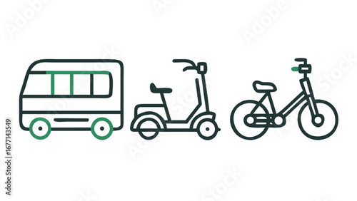 Vector art of set of transport icons featuring a bus, scooter, and bicycle, showcasing various modes of transportation