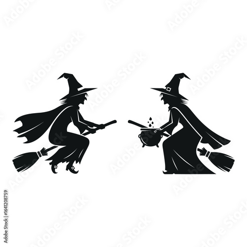 Vector art of two witches flying on broomsticks isolated on white background
