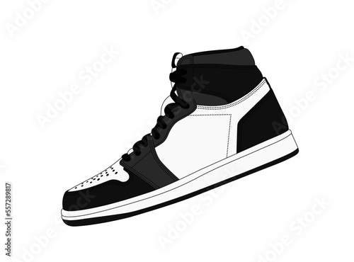 Vector black retro sneakers silhouette. American style sneaker side view. Trendy men footwear illustration. Shoes shop logo. Fashion shoe sign. Realistic casual sport high boots. Basketball sportswear
