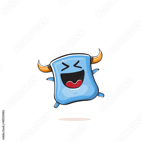Vector cartoon funny blue monster with horn isolated on white background. Smiling silly blue monster print sticker design template. Ghost, troll, gremlin, goblin, devil and monster