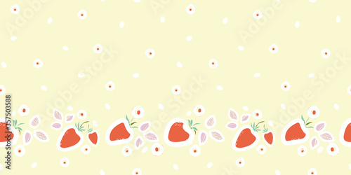 Vector cute pastel strawberry summer border. Graphic modern kawaii cut out repeating design. Hand drawn berry fruit pattern with leaf and dot on cream colored background. Hand drawn pastel backdrop.