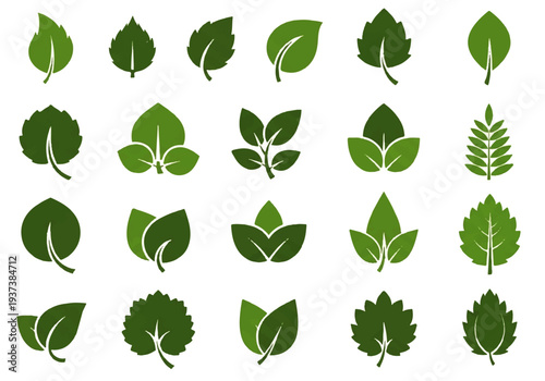 Vector flat design illustration of various green leaves in different shapes and sizes, arranged in rows on a white background.