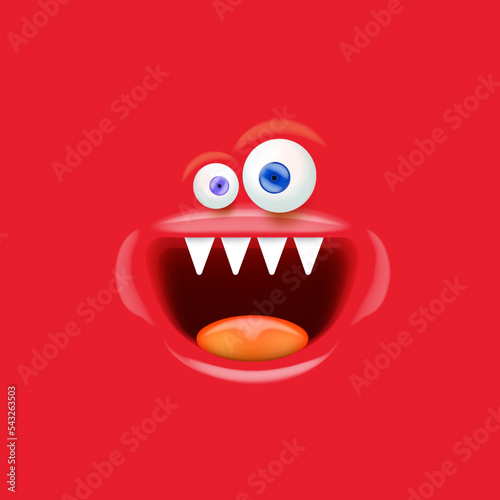 Vector funny red monster face with open mouth with fangs and eyes isolated on red background. Halloween cute and funky monster design template for poster, banner and tee print