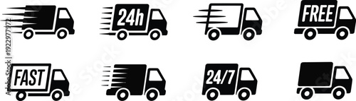 Vector graphic icons of fast delivery trucks, express shipping, 24-hour service, and free transport, essential for modern logistics
