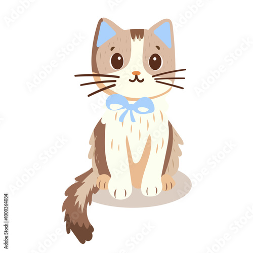 Vector illustration, cute kitten, sitting fluffy, bow, paws, isolated, flat