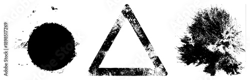Vector illustration featuring distressed circle, triangle, and tree silhouette with ink splatter texture, ideal for graphic design, posters, or UI elements.