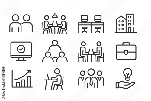Vector illustration icons depicting various business and teamwork activities in a professional setting