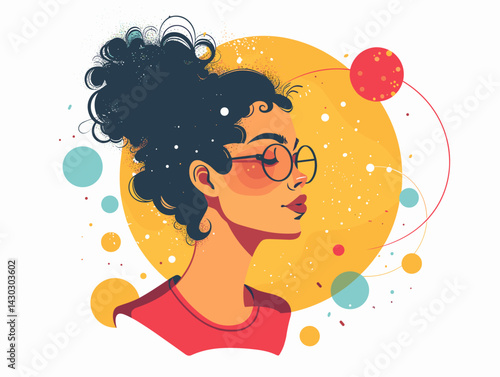 Vector illustration of a beautiful girl with curly hair and glasses on a colored background.