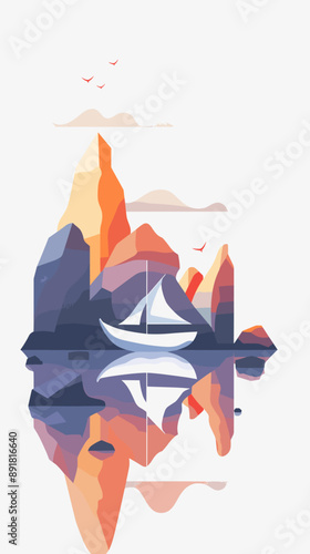 Vector illustration of a boat on a lake in the mountains. Flat design.