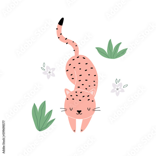 Vector illustration of a cute cheetah, tropical leaves and flowers