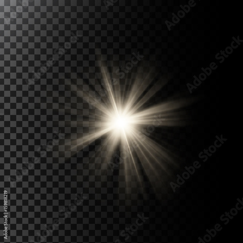 Vector illustration of a glowing light effect with rays and lens flares isolated on a dark translucent background