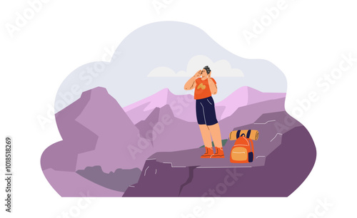 Vector illustration of a lost man screaming for help standing on the edge of a cliff.