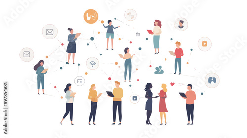 Vector Illustration of People Connecting and Sharing Social Media Concepts, Networking, and Communication Icons for Digital Engagement and Online Interaction