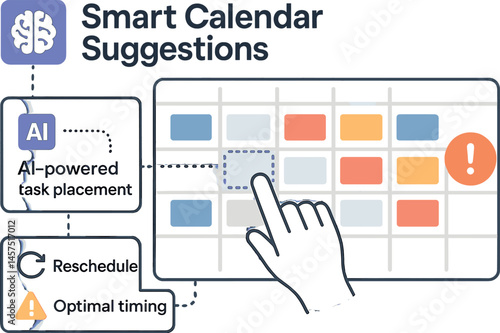 Vector illustration of smart calendar suggestions with AI-powered task placement, reschedule buttons, and optimal timing alerts