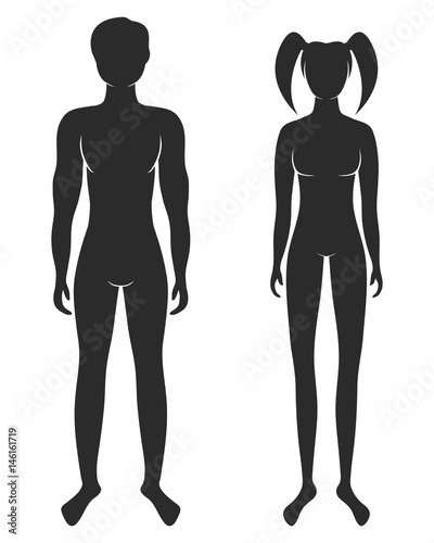 Vector illustration of standing silhouettes of man and woman, female and male signs isolated on white
