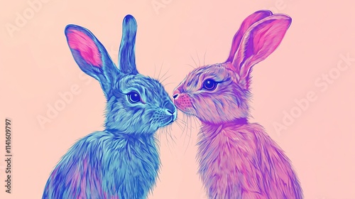 Vector illustration of two rabbits. Simulated risograph and glitch effects. Perfect for fabric, textiles, clothing, wrapping paper, wallpaper and posters.