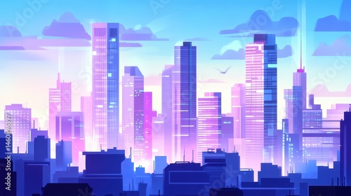 Vector Illustration of Urban Cityscape at Sunset with Tall Buildings and Clouds in Pink and Blue Tones, Modern Flat Style, Wide Angle