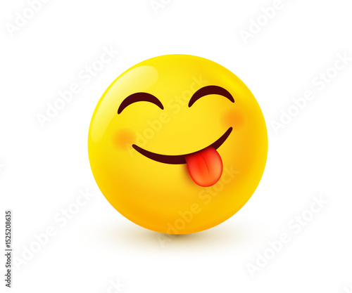 Vector illustration of yellow smile emoji. Happy emotion face with smile and tongue. 3d cartoon style design of positive emoticon. Funny smiley character icon. Happy mood and facial expression