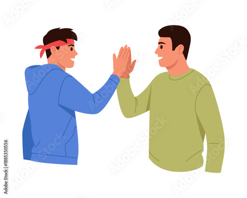 Vector illustration of young guys at a meeting, giving each other a high five. Cartoon scene of cheerful guys with raised hands, clapping palm to palm, greeting gesture isolated on white background.
