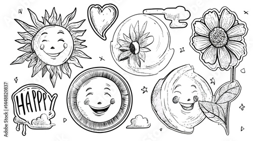 Vector in linear style, design templates and stickers, happy and groovy smiling character, sun and flower -