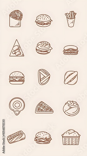 vector line art of fast food icons like hot dog, hamburger and french fries, vector illustration in vintage style,