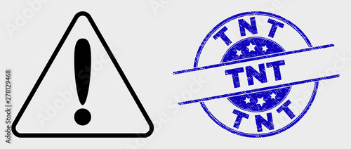 Vector line warning icon and TNT seal stamp. Blue round distress seal with TNT phrase. Black isolated warning icon in line style.