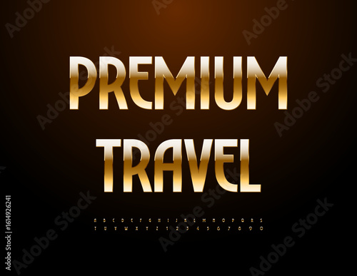 Vector Luxury sign Premium Travel. Modern Glamorous Font. Elegant Gold Alphabet Letters and Numbers set.