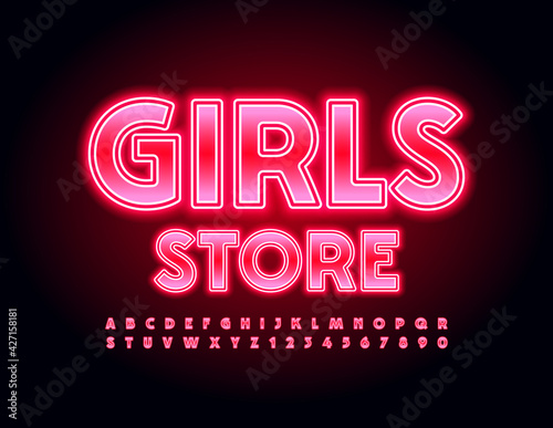 Vector modern logo Girls Store. Glowing Elegant Font. Bright light Alphabet Letters and Numbers set