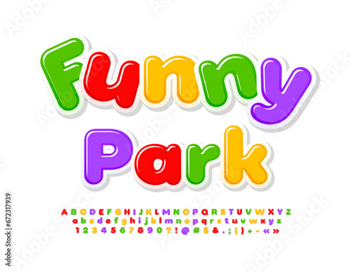Vector playful sign Funny Park. Kids Glossy Font. Bright Colorful Alphabet Letters and Numbers