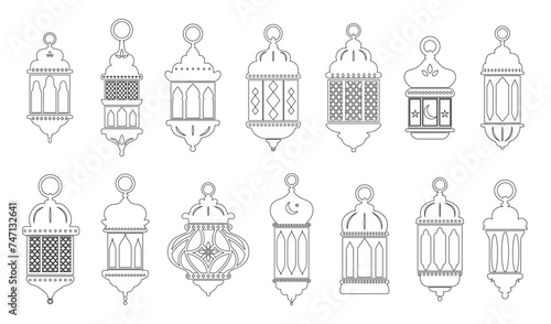 Vector Ramadan arabian islamic lanterns outline shapes set isolated on white. Vintage lamps silhouettes. Arabesque eastern style clipart