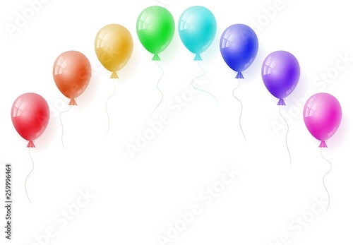 Vector realistic helium colorfull rainbow balloons. Perfect for ad, sale, flyer, greeting card, invitation, poster, offer, poster. Free space for the text. Three-dimensional illustration. Eps 10.