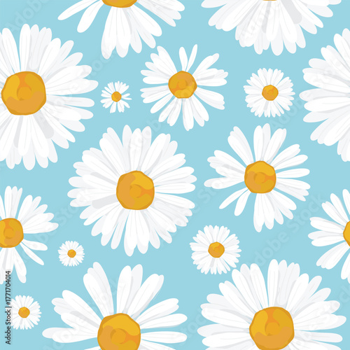 Vector seamless floral pattern with white daisy flowers and yellow centers on blue background, fresh spring botanical design for fabric and wallpaper