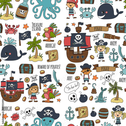 Vector seamless pattern Pirate party for children Kindergarten Kids children drawing style illustration Picutre with pirate, whale, treasure island, treasure map, skulls, flag, ship Birthday party