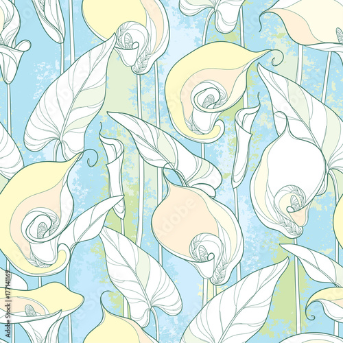 Vector seamless pattern with outline Calla lily or Zantedeschia. Ornate white flower, bud and leaves on the pastel colored background. Floral pattern in contour style with calla for summer design.