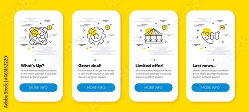 Vector set of Computer fan, Carousels and Settings gear line icons set. UI phone app screens with line icons. 360 degree icon. Pc ventilator, Attraction park, Technology process. Vector