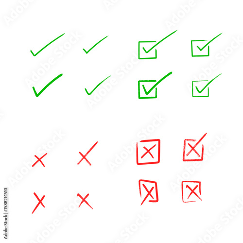 Vector Set of Doodle red cross and green checkmark. Collection trendy symbol. Hand drawn. Button. No, yes. False, reject, сorrect. Wrong and right.